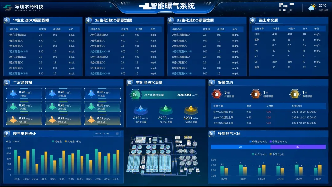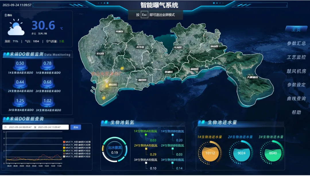 系统如同一个精明的“空气分配管家”,同时采集各分区反馈DO、温度、污泥浓度、进水流量、氨氮等数据,基于这些数据精确计算每个生物池分区当下的需气量。